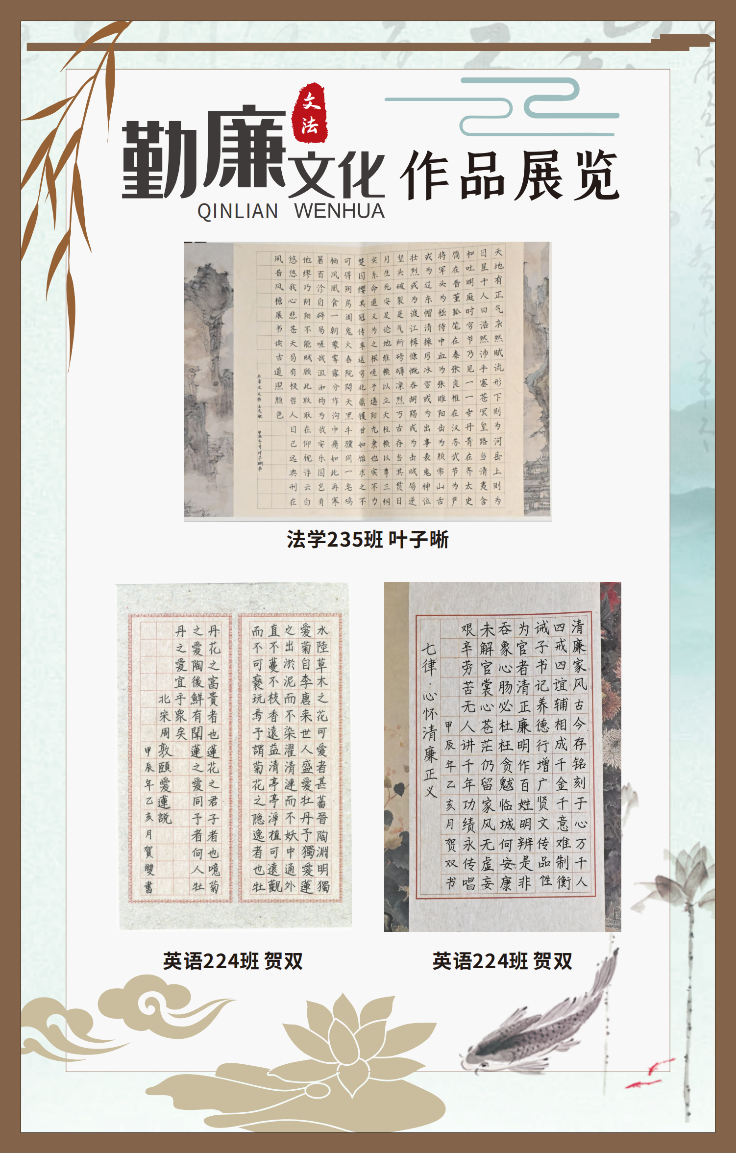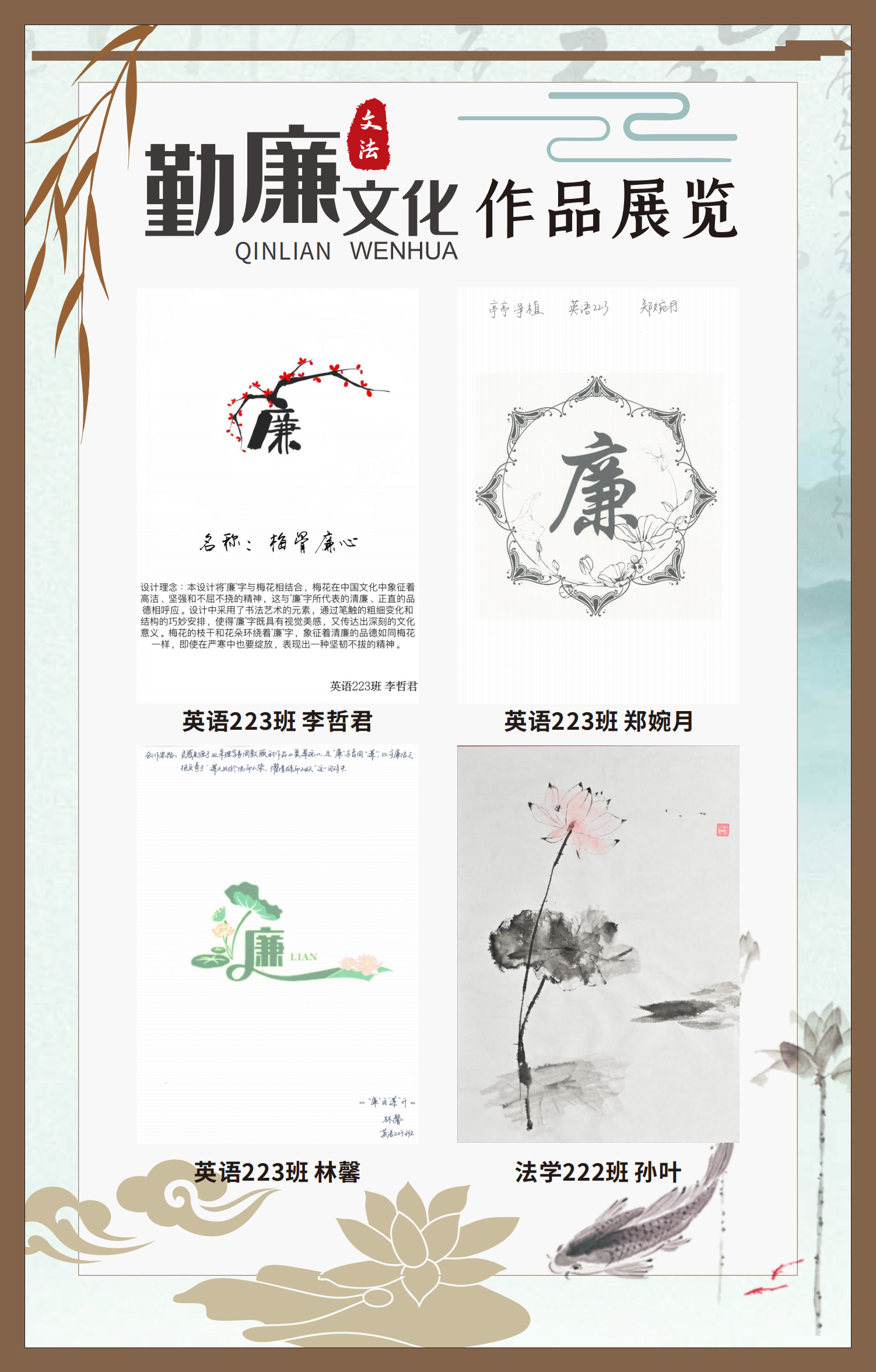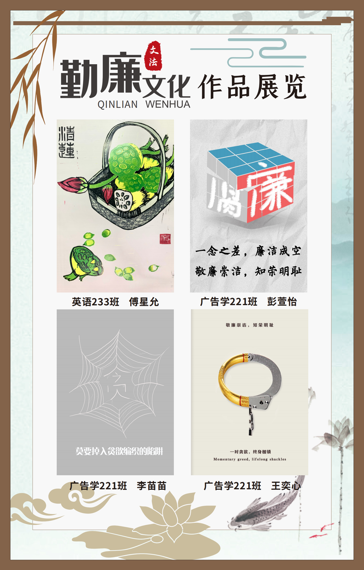 文法學(xué)院“步步生廉”文化走廊,植根于“六廉頌”清廉文化品牌,依托學(xué)院勤廉文化月活動,以師生清廉主題作品為媒介,系統(tǒng)呈現(xiàn)文法學(xué)院師生“知廉、守廉、促廉、倡廉”的實踐自覺,全景展現(xiàn)將新時代廉潔文化建設(shè)融入“立德樹人”根本任務(wù)的生動范例。