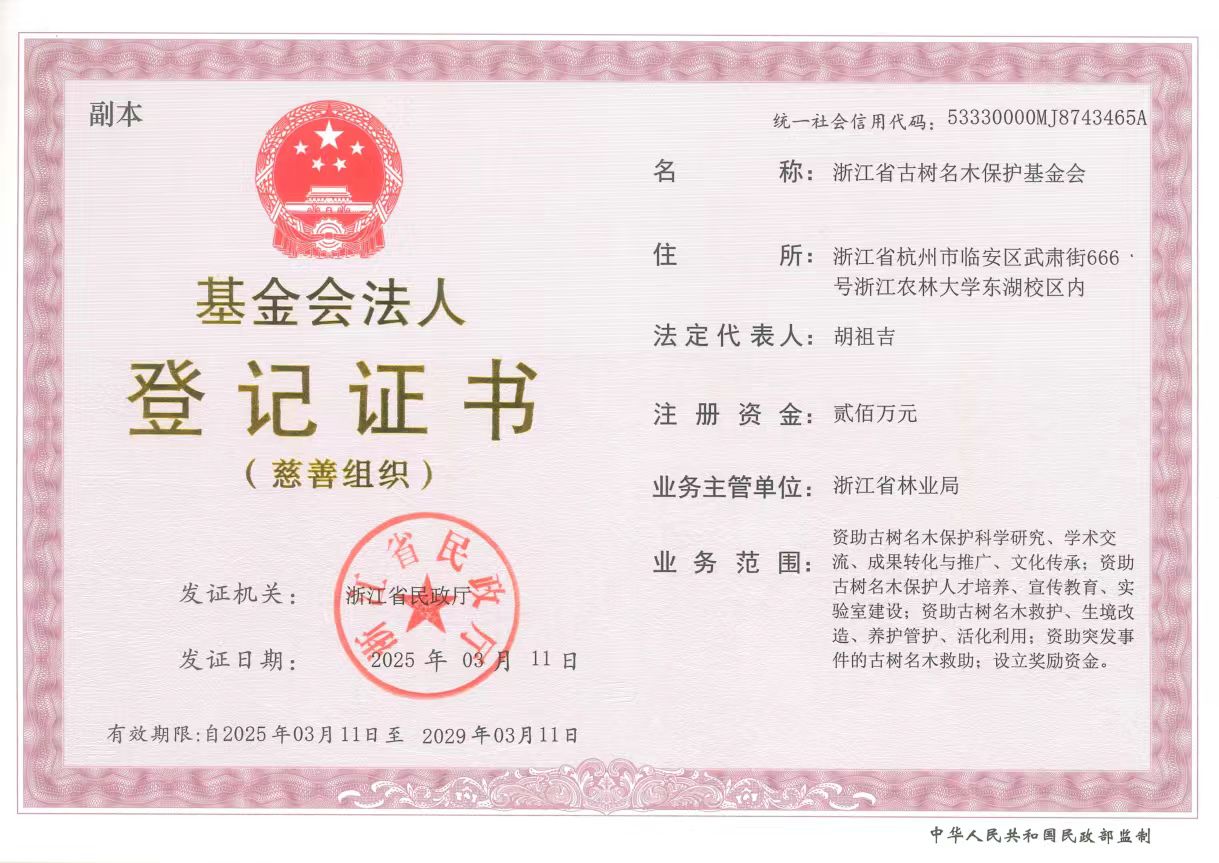 據(jù)悉,浙江省古樹名木保護基金會是由浙江農(nóng)林大學(xué)和杭州一寸之萌生態(tài)科技有限公司共同發(fā)起成立,經(jīng)浙江省民政廳核準(zhǔn)登記(2025年3月11日)的慈善組織。注冊資金200萬元;業(yè)務(wù)主管單位為浙江省林業(yè)局。基金會的業(yè)務(wù)范圍包括資助古樹名木保護宣傳教育、文化傳承、人才培養(yǎng)、科學(xué)研究、實驗室建設(shè)、學(xué)術(shù)交流、成果轉(zhuǎn)化與推廣;資助古樹名木救護、生境改造、養(yǎng)護管理、活化利用;設(shè)立獎勵資金。