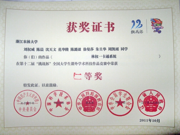 浙農林大新聞網訊 10月19日晚,由共青團中央、中國科協、教育部、全國學聯和遼寧省政府共同主辦的第十二屆“挑戰杯”競賽終審決賽在大連理工大學隆重閉幕。由我校徐愛俊老師指導,劉權威、陳晨、沈天文、范華隆、陳潞盈、徐曼莎、朱旻華、周凱瑤等同學共同完成的作品《林權一卡通系統》,榮獲全國二等獎。