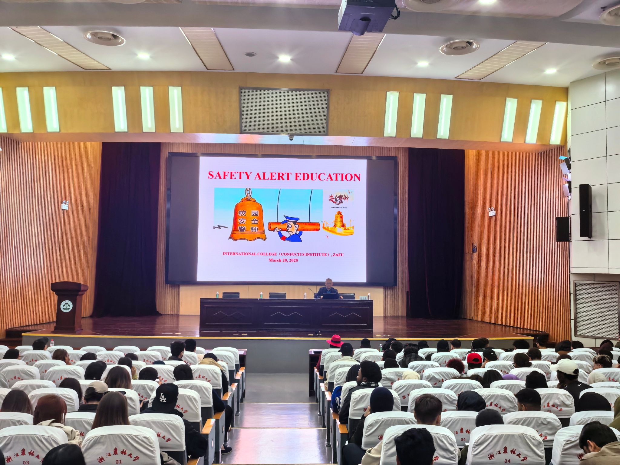 趙有華和學院校外輔導員王益龍警官分別為全體國際學生做了法制安全教育專題講座,緊密結合國際學生實際情況,從禁毒、出入境、交通、治安、防詐騙、宗教等方面出發,以案釋法,告誡國際學生嚴格遵守法律法規和校紀校規,加強自身安全防范意識,維護國際學生的良好形象。會后,全體國際學生簽署了“防范電信網絡詐騙”承諾書。