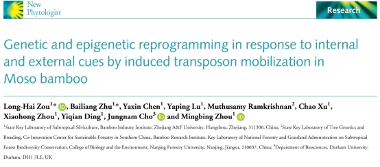 浙江農(nóng)林大學(xué)竹子研究院、省部共建亞熱帶森林培育國家重點(diǎn)實驗室為該論文第一單位,竹子研究院周明兵教授和英國杜倫大學(xué)Jungnam Cho教授為該論文通訊作者。竹子研究院鄒龍海博士為該論文第一作者,朱柏良碩士為共同第一作者。碩士生許超和已畢業(yè)研究生陳婭欣、魯亞萍、丁一倩參與了部分工作。南京林業(yè)大學(xué)Ramkrishnan副教授、浙江農(nóng)林大學(xué)林生院周小紅副教授亦為該研究提供了指導(dǎo)和支持。