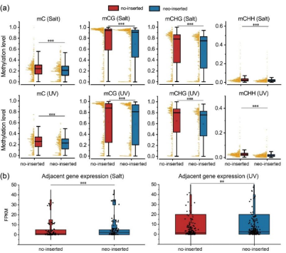 在該研究中,研究組從遭受多種非生物脅迫和不同發(fā)育階段的毛竹組織中,鑒定出大量被激活的LTR逆轉(zhuǎn)座子。這些轉(zhuǎn)座子激活與位點(diǎn)特異性去甲基化相關(guān),并且它們主要分布在蛋白質(zhì)編碼基因附近。有趣的是,這些轉(zhuǎn)座子激活與鄰近基因的表達(dá)呈正相關(guān),而這些鄰近基因主要是脅迫應(yīng)激反應(yīng)和發(fā)育的相關(guān)因子。進(jìn)一步研究發(fā)現(xiàn),響應(yīng)脅迫和發(fā)育信號而發(fā)生的LTR逆轉(zhuǎn)座子新轉(zhuǎn)座事件,也傾向于插入近蛋白編碼基因。這些新插入位點(diǎn)的去甲基化延伸到插入位點(diǎn)兩端,導(dǎo)致近端位點(diǎn)甲基化水平降低,促進(jìn)附近編碼基因表達(dá)。最后,研究組通過轉(zhuǎn)座印跡跟蹤和轉(zhuǎn)基因試驗,證實了LTR逆轉(zhuǎn)錄轉(zhuǎn)座子新插入位點(diǎn)的偏好性及其對應(yīng)激和發(fā)育適應(yīng)的影響。該研究揭示了LTR逆轉(zhuǎn)錄轉(zhuǎn)座子在逆境和發(fā)育中被激活,通過偏好性的轉(zhuǎn)座和改變DNA甲基化水平,進(jìn)而改變相關(guān)基因的表達(dá),參與抗逆和發(fā)育。